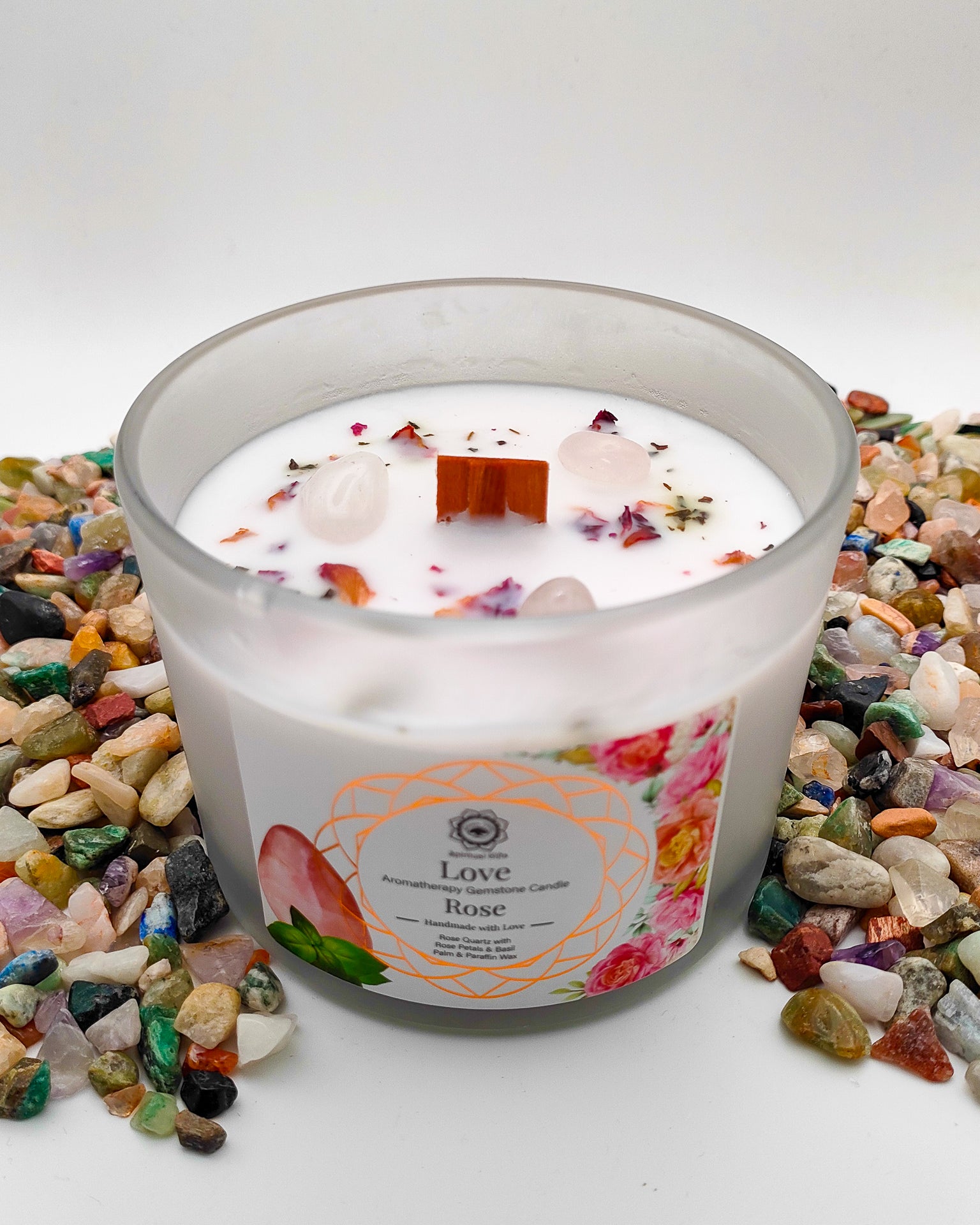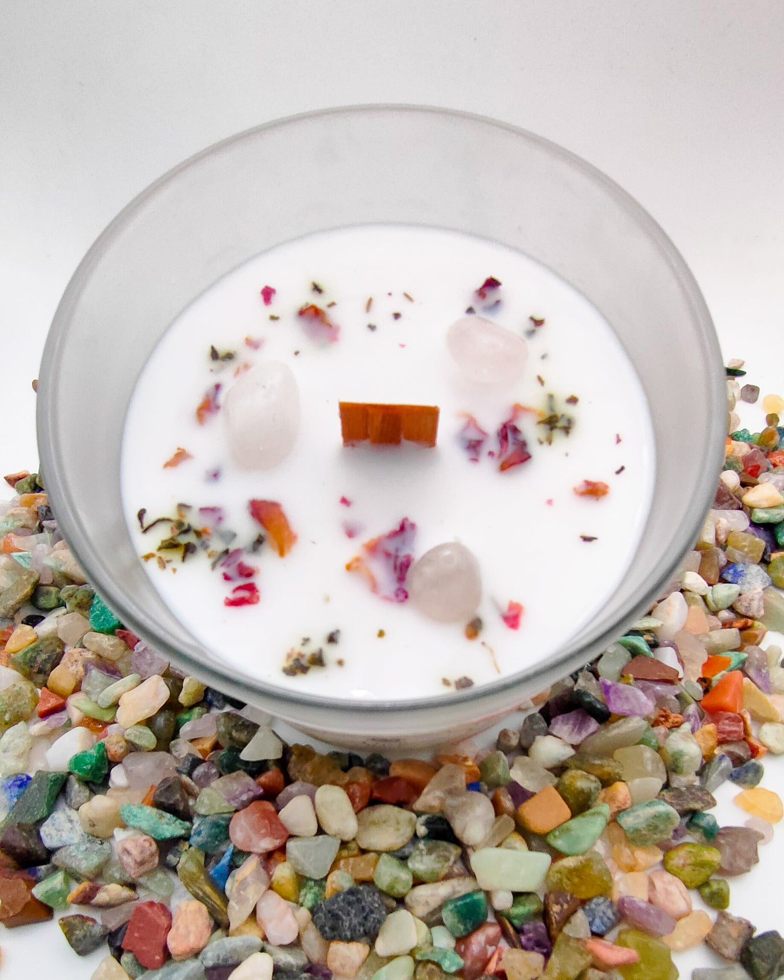 Candela in paraffina con pietre semipreziose, fatta a mano con stoppini in legno. Un vero capolavoro creato con amore e impreziosite con erbe e pezzi floreali. Questa candela ti invita a intraprendere un viaggio unico fatto di serenità e piacere.
