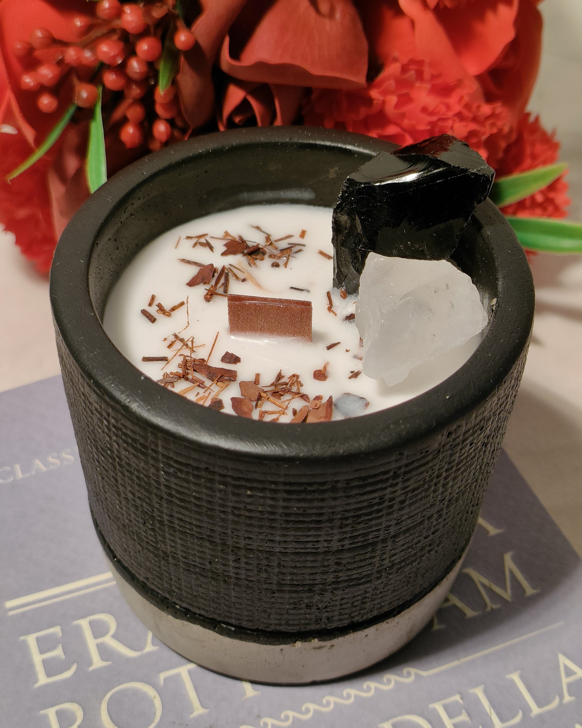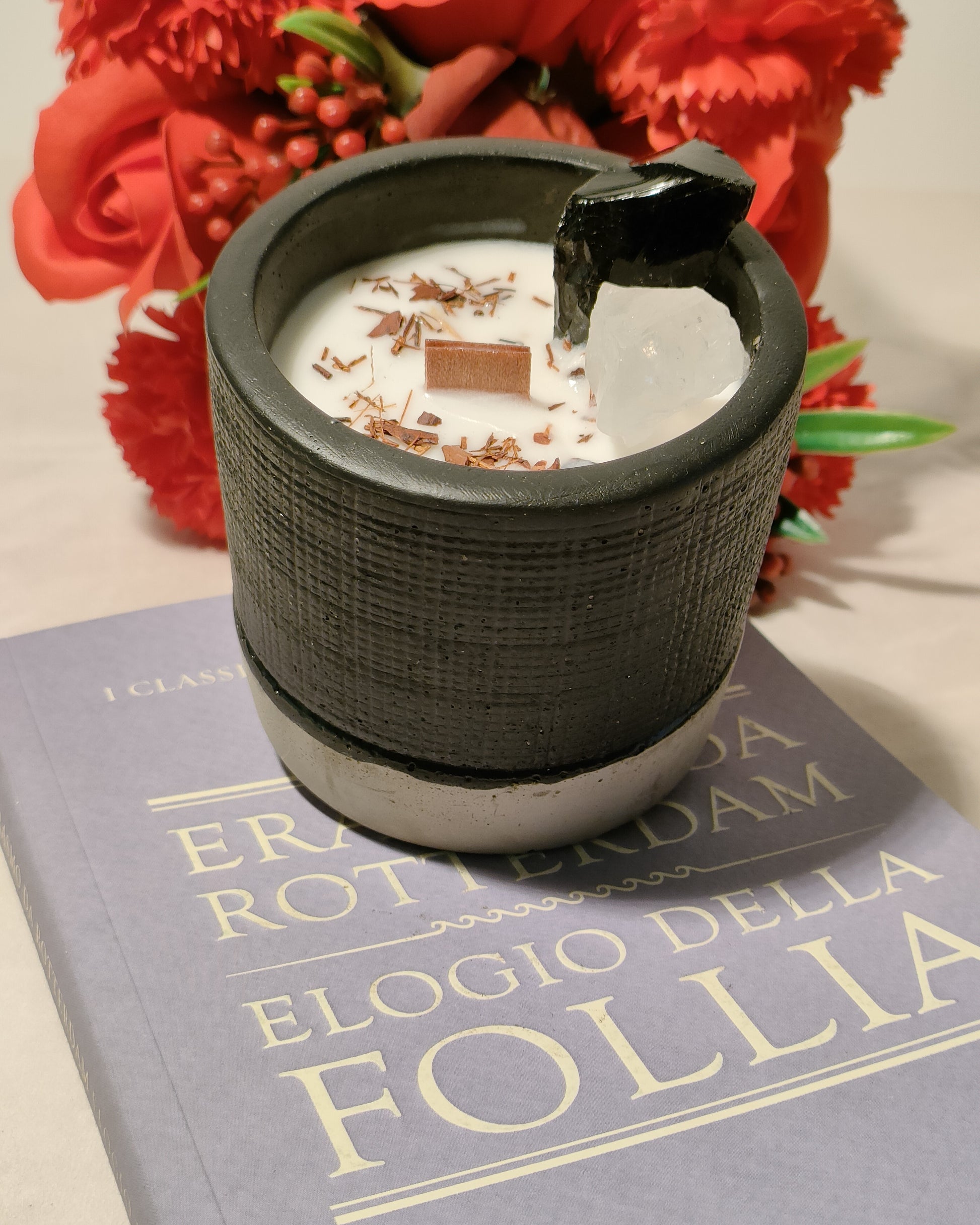 Candele con stoppino in legno e vasetto in cemento con cristalli e spezie pe le tue energie.