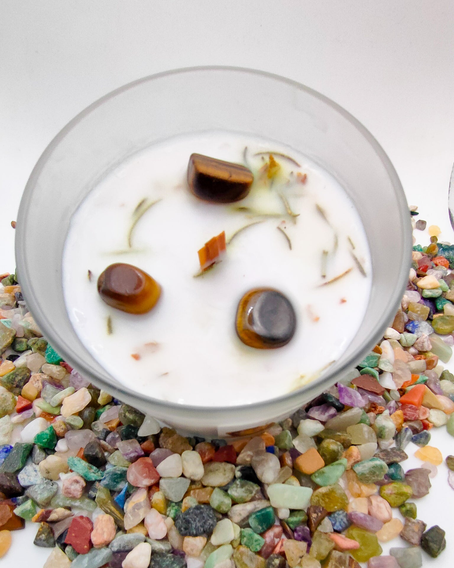 Candela in paraffina con pietre semipreziose, fatta a mano con stoppini in legno. Un vero capolavoro creato con amore e impreziosite con erbe e pezzi floreali. Questa candela ti invita a intraprendere un viaggio unico fatto di serenità e piacere.