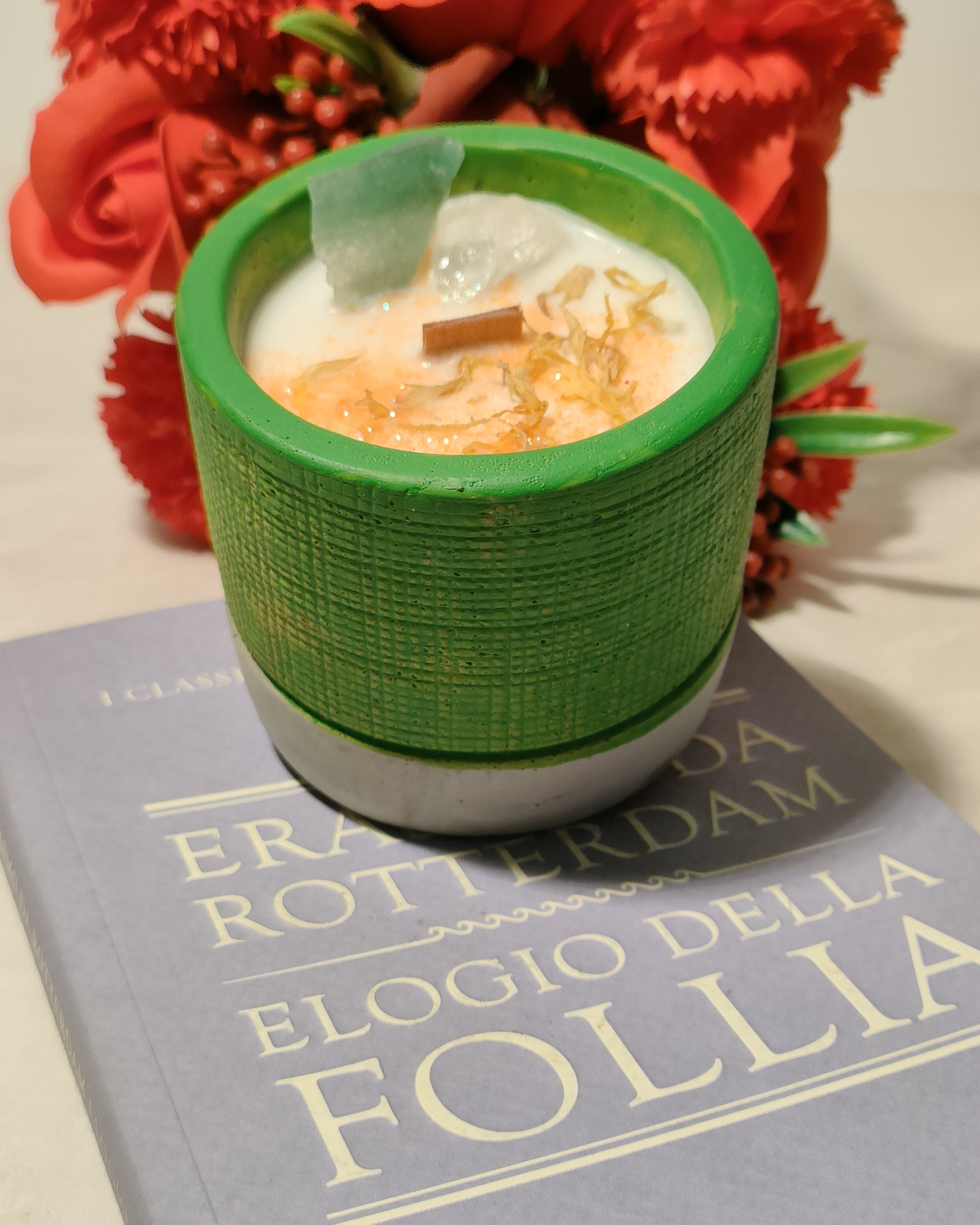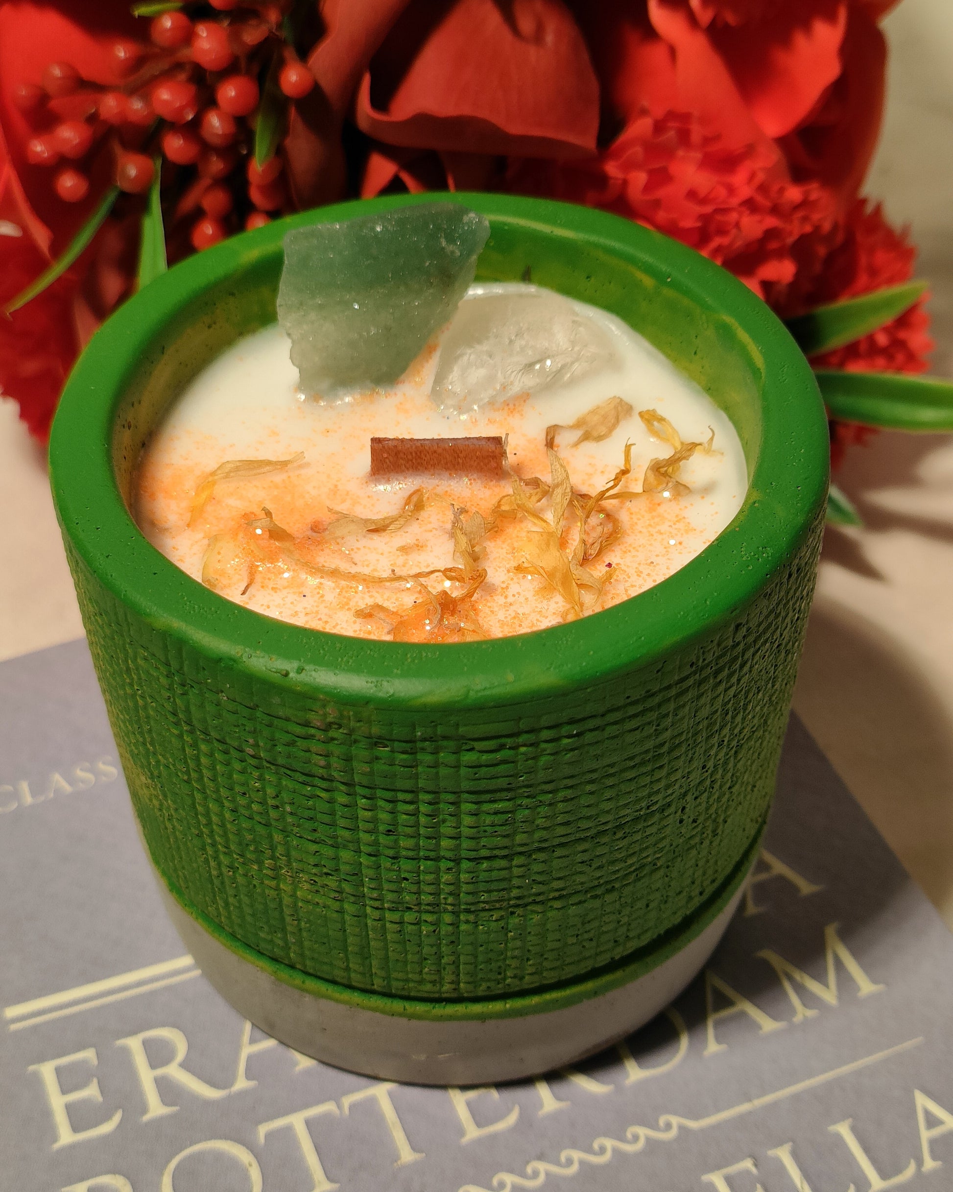 Candele con stoppino in legno e vasetto in cemento con cristalli e spezie pe le tue energie.