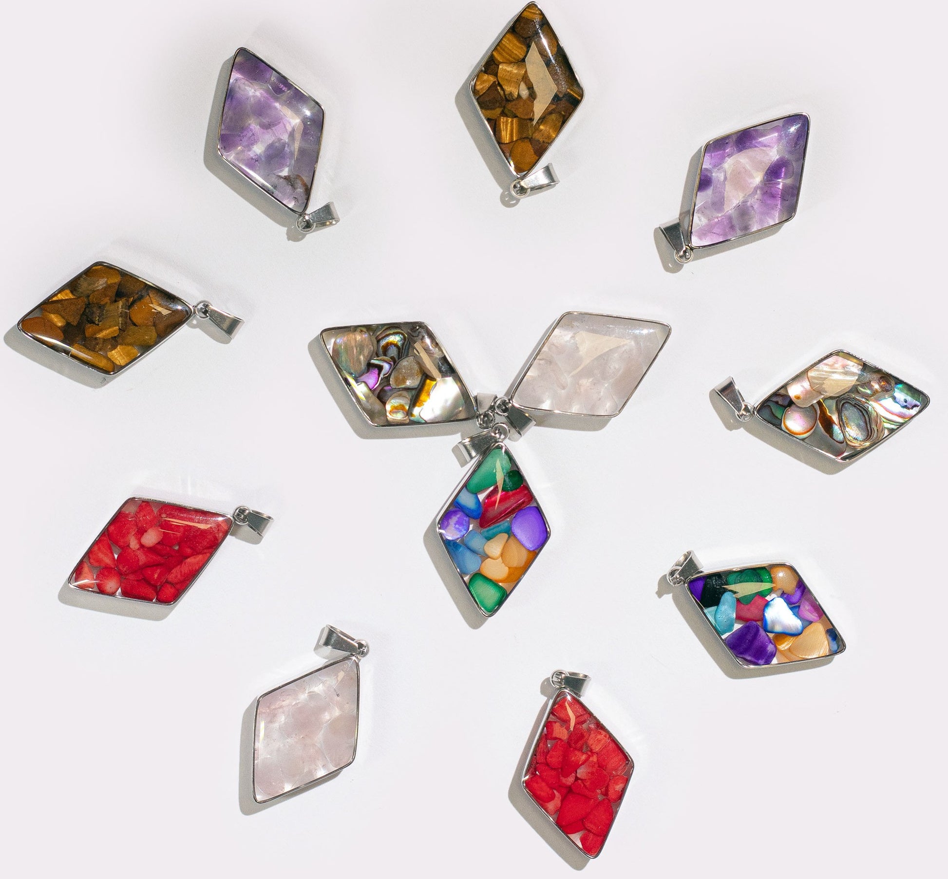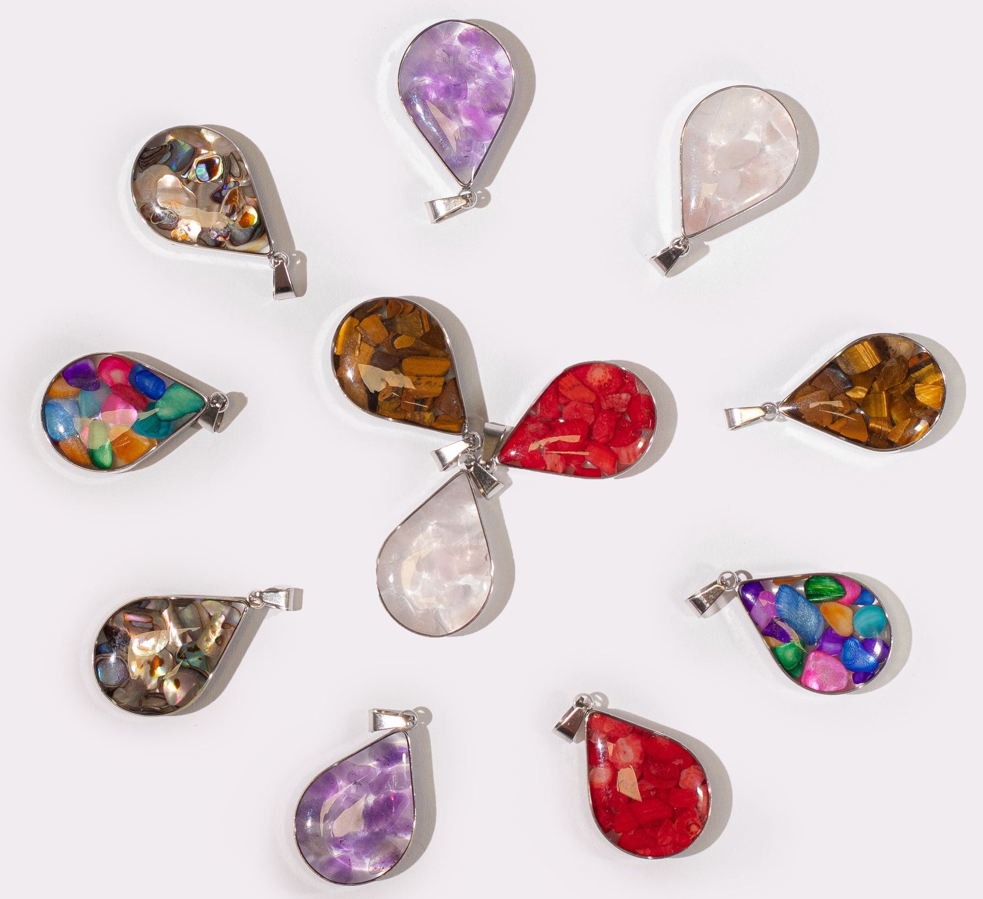 Collana con raffinati pendenti a diamante, goccia e cuore in acciaio inossidabile, impreziositi da frammenti di pietre semipreziose e conchiglie, racchiusi in una sottile resina trasparente ,che esalta la loro bellezza.