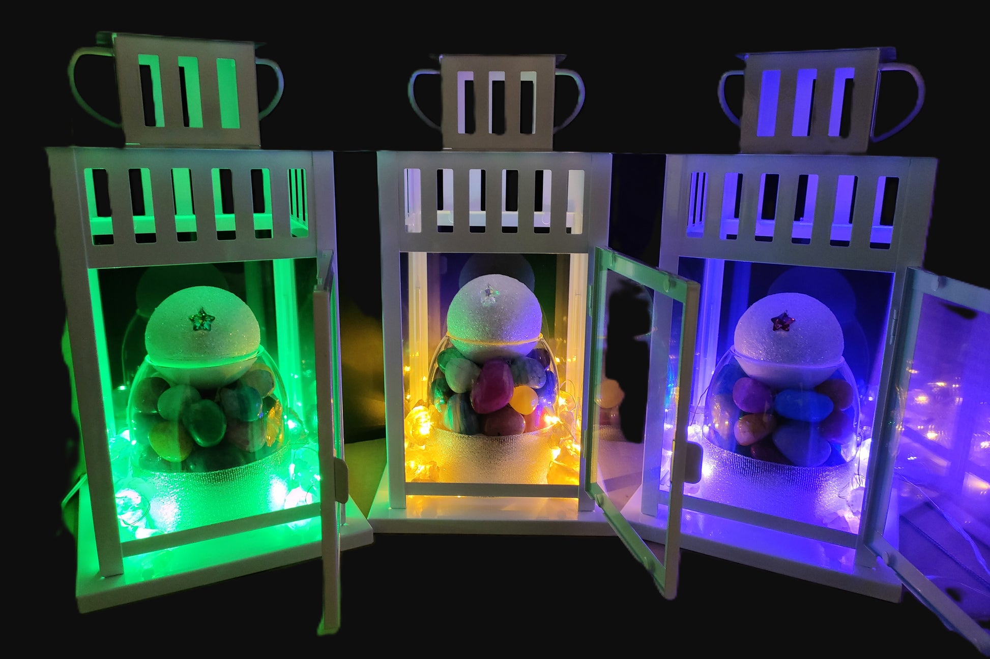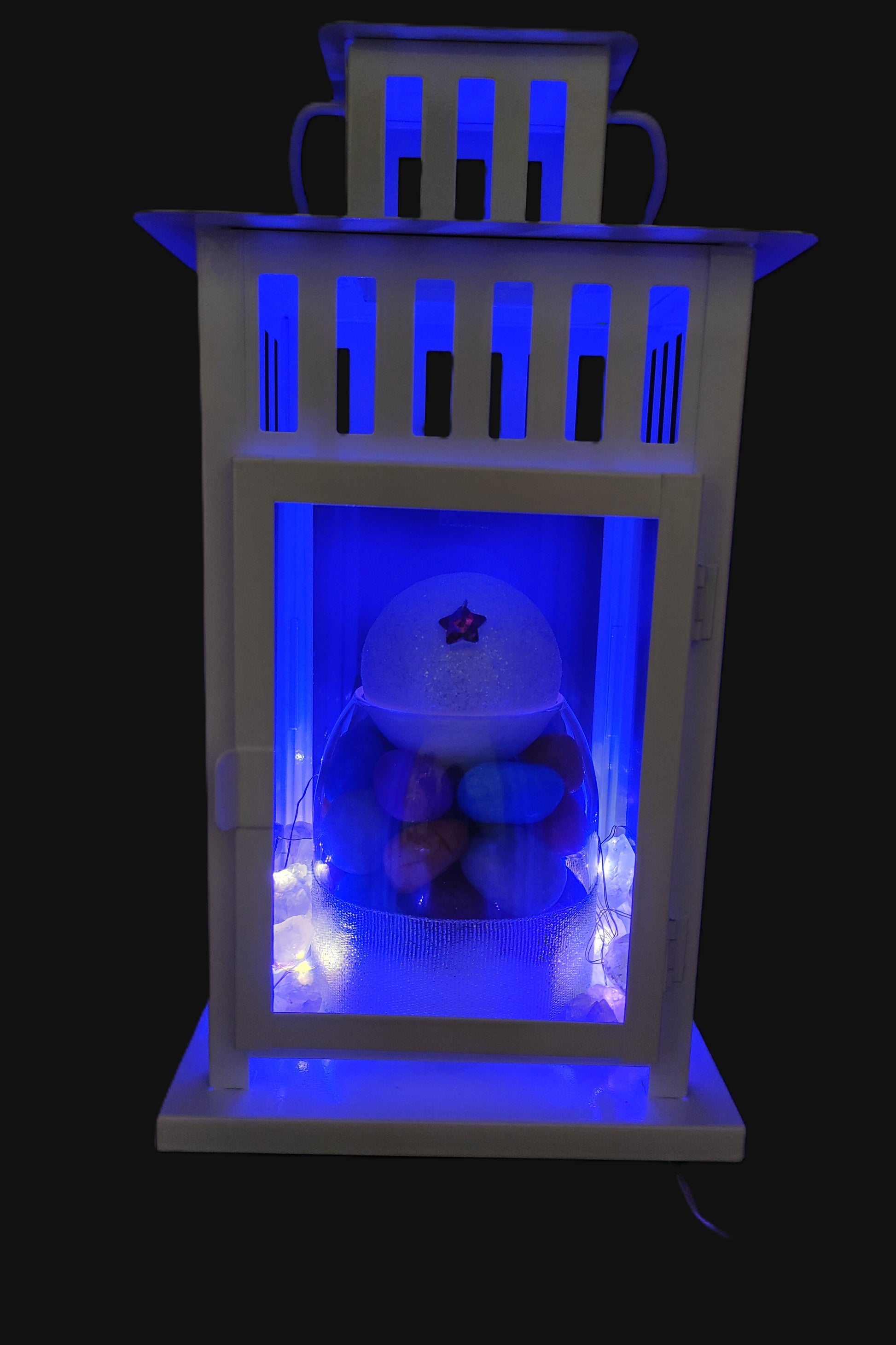 L'ampolla racchiude un tesoro di giade di tutti i colori , pietre sacre di armonia e fortuna. Al momento dell'acquisto, scegli quale cristallo luminoso accompagnerà la tua lampada magica: