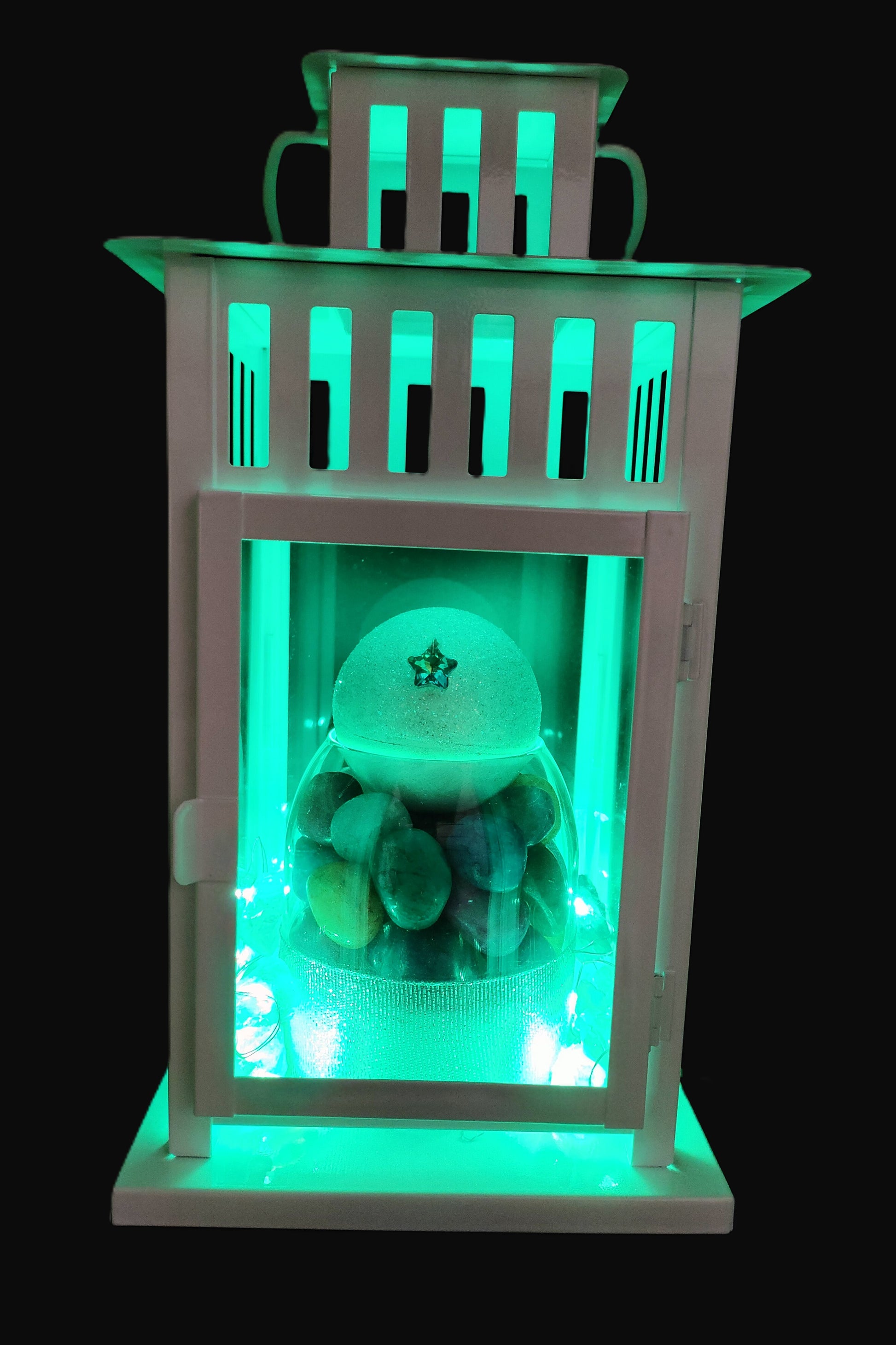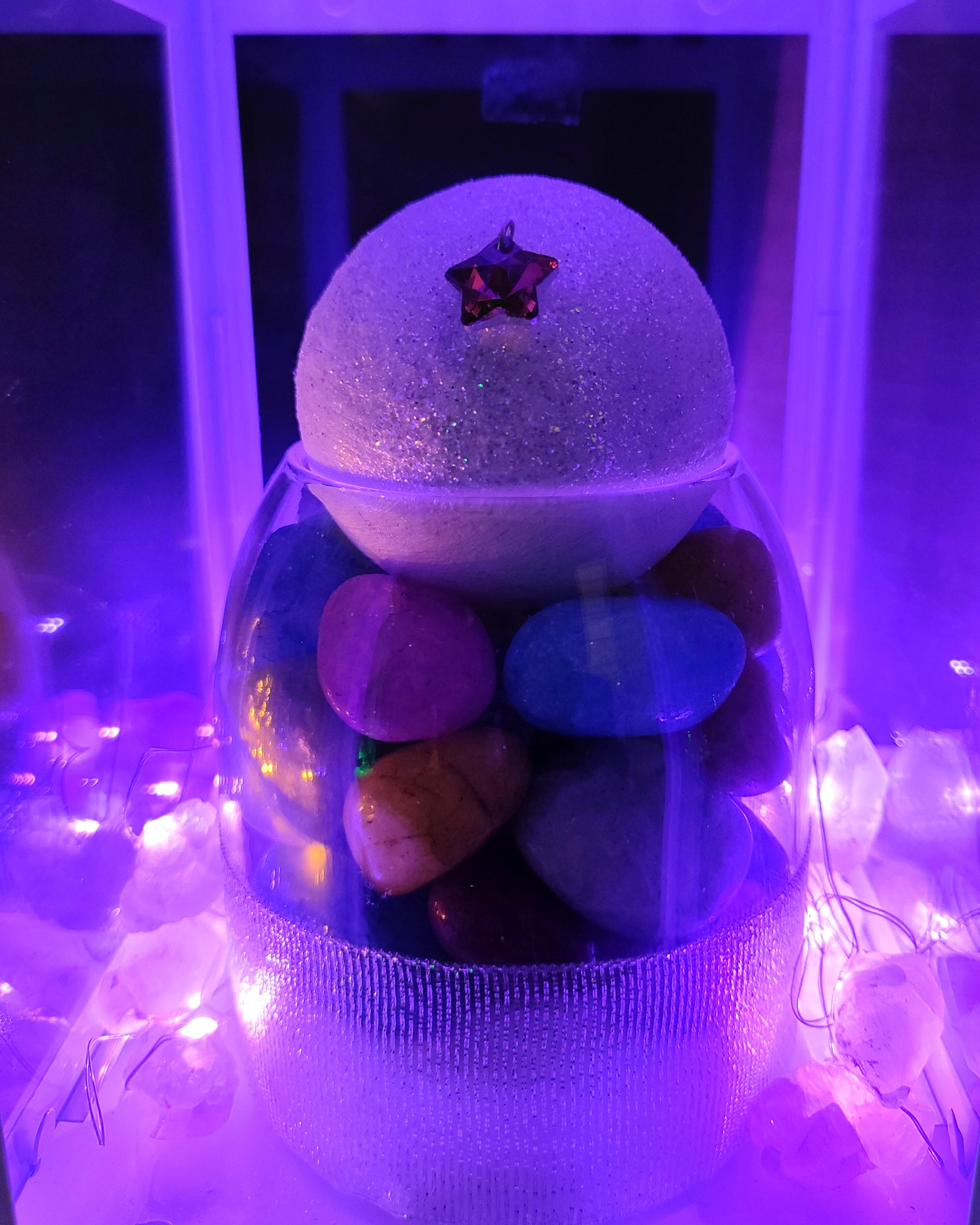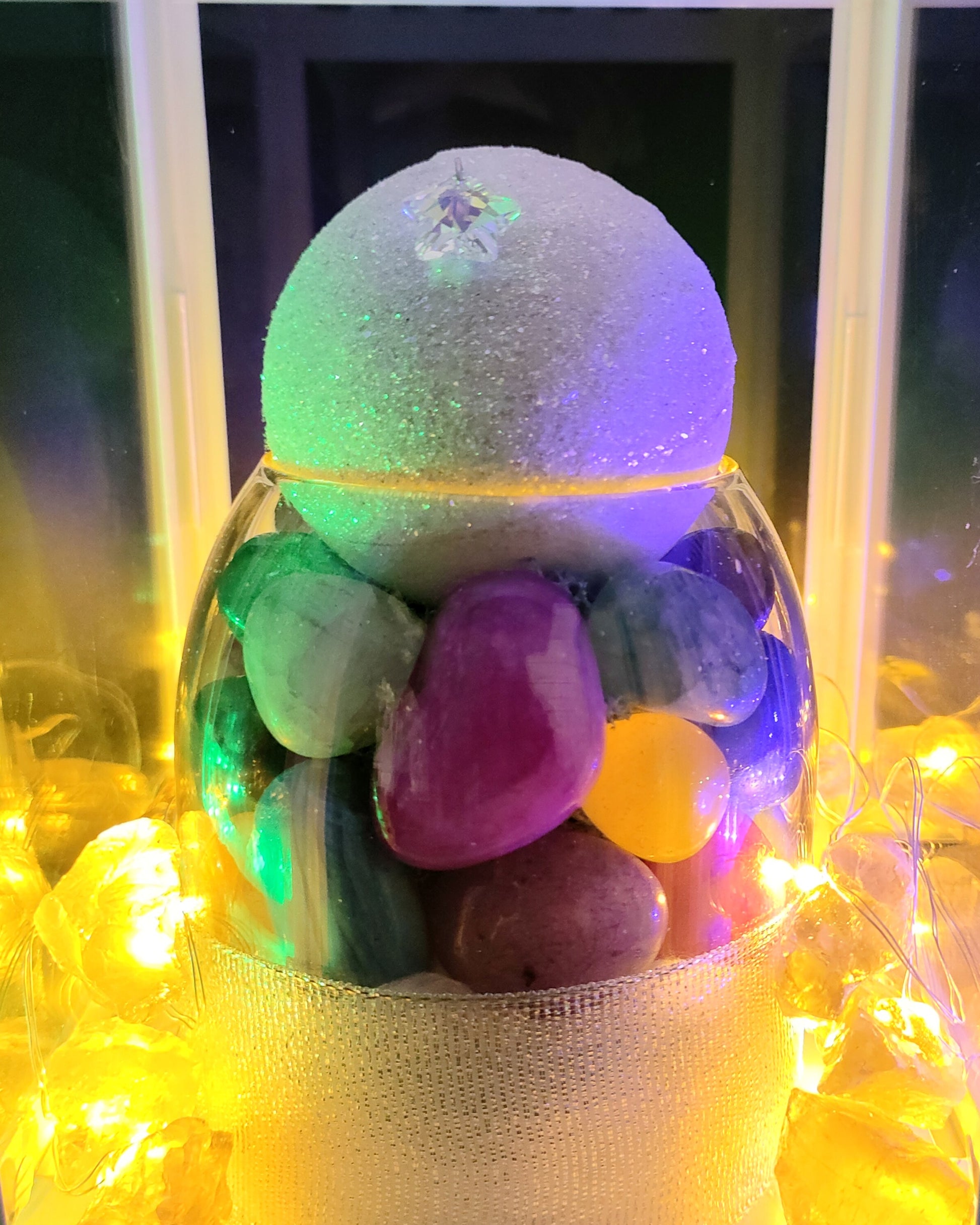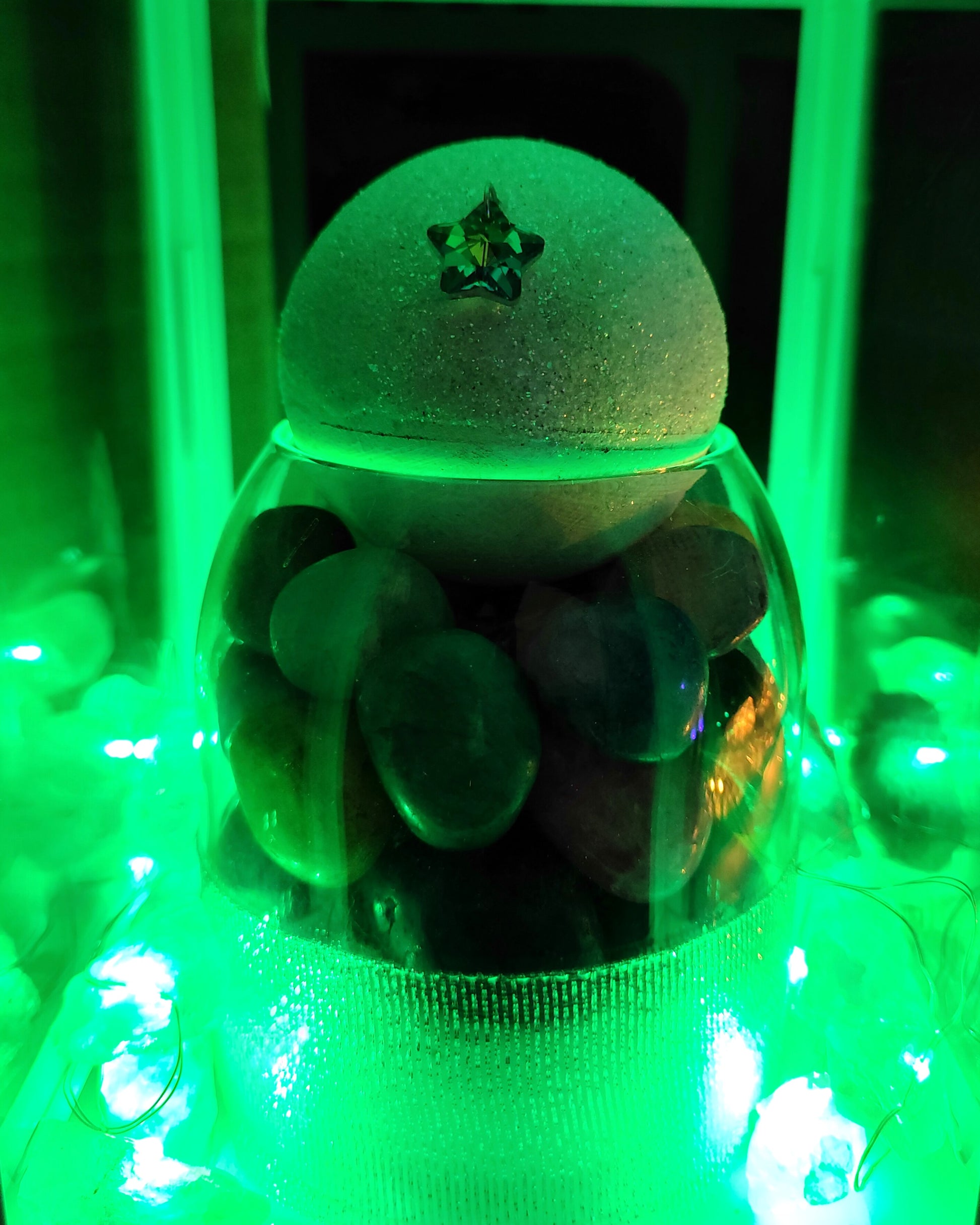 Questa straordinaria lampada magica di Carmensita cattura tutta la potenza della Super Luna Piena del 5 dicembre 2025, l'ultima e più luminosa dell'anno. Un'ampolla preziosa colma di giade multicolore che si illumina di energia celeste.
